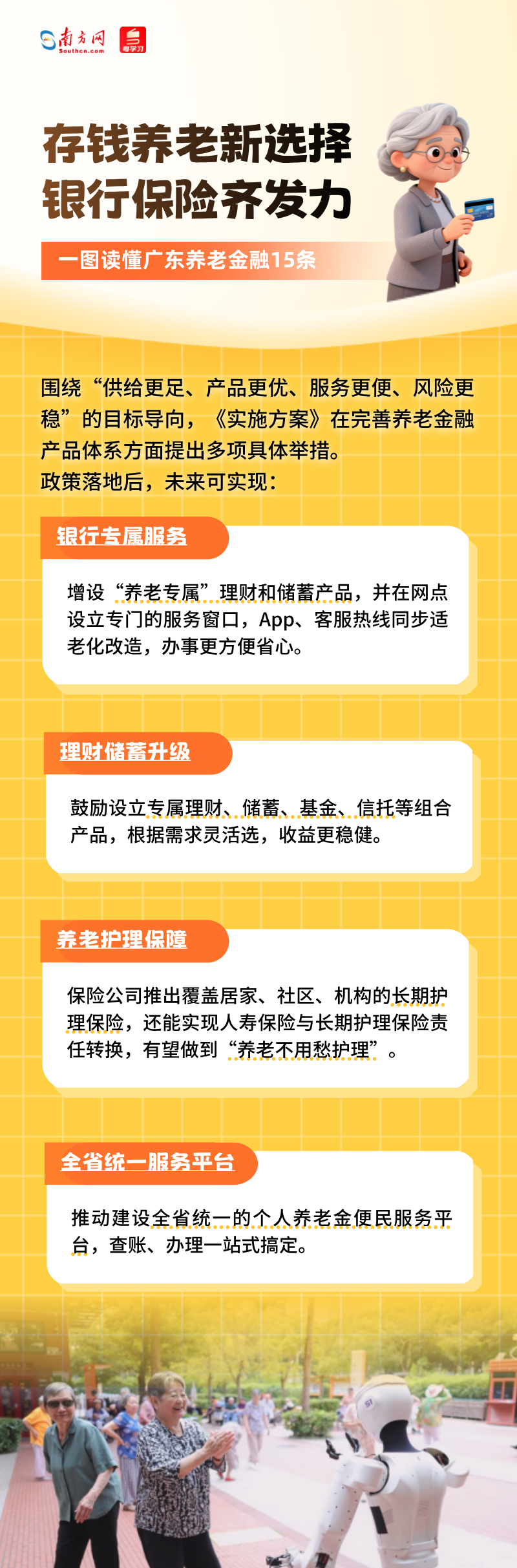 11月17日,广东多部门联合发布首个养老金融专属政策——《广东省推动养老金融高质量发展实施方案》(以下简称《实施方案》)。这也是广东首个针对养老金融专门规划的政策。 《实施方案》提出了15条具体措施,明确到2028年基本建立“广东特色养老金融体系”。未来广东人如何存钱养老?如何规避风险?跟随这组海报,了解新政将给你我的生活带来的真正改变。统筹:余彦斌 规划设计:世轩 - 上一篇:2025广东省学生桥牌比赛落下帷幕,全运会冠军分