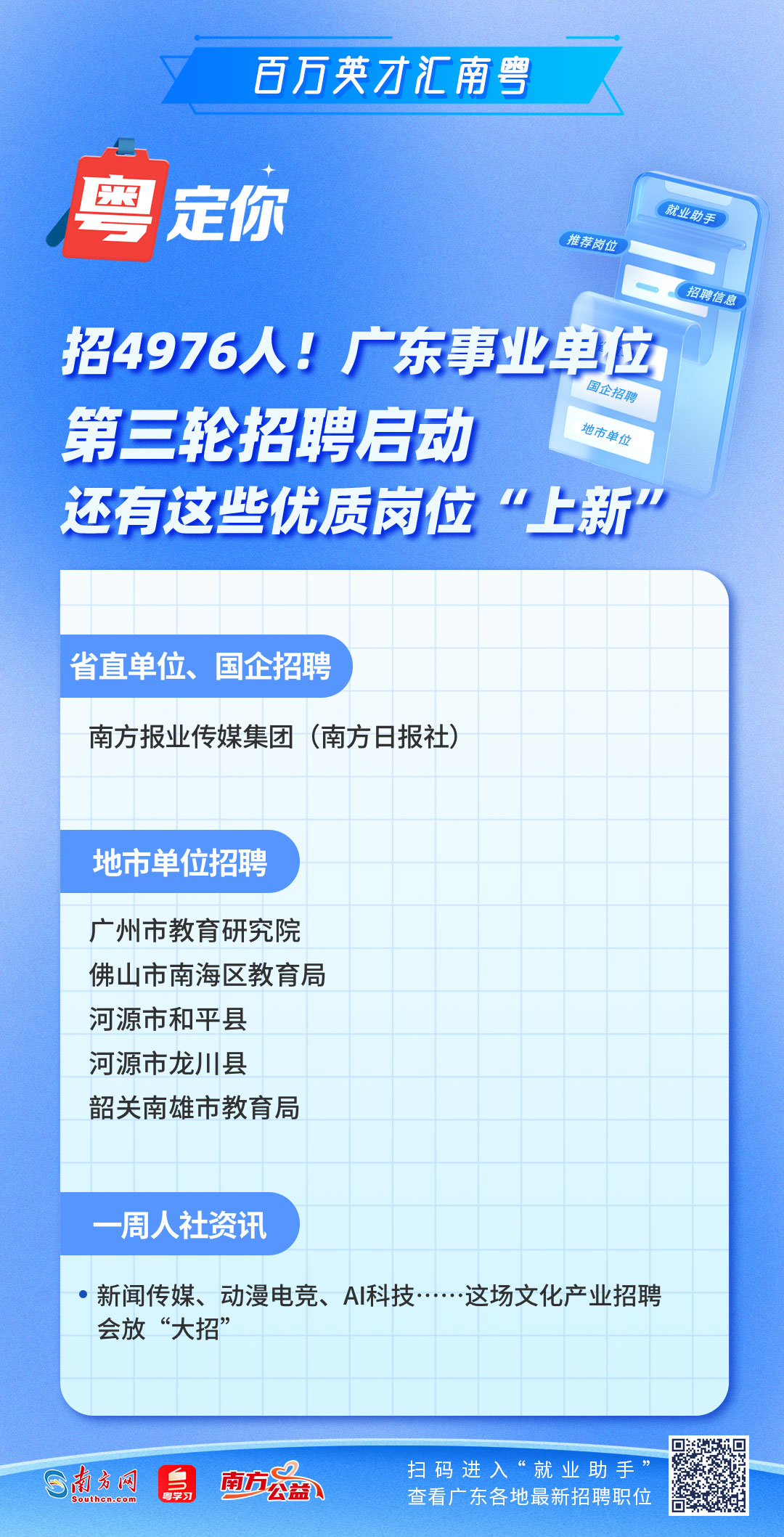 南方网联合广东学习客户端为您整理总结了本周最新的就业信息!广东省2025年第三轮事业单位集中公开招聘已公布。第二轮招聘中未填补的职位将在第三轮滚动招聘中进行补充。全省各级事业单位计划招聘工作人员共计4976人。查看详情: 就业信息方面,广州、佛山、河源、韶关等地正在招聘事业单位教师和工作人员。赶快将简历投递到您心仪的岗位吧!本期招聘信息速览↓再次点击按钮即可查看广东最新招聘岗位及各行业热门招聘信息↑★南方传媒集团报(南方日报)【招聘人员】招聘部分顶尖AI模型、网络安全专家、报道等V查看详情 ★广州教育研究院【招聘人员】招聘教学研究人员8名。 【报名时间】2025年11月17日9:00至2025年11月21日17:00。申请人须在规定时间内登录指定网站进行报名。 【薪酬福利】 招聘人员均为事业单位工作人员。聘用期间,按照用人单位公布的岗位级别聘用。薪资福利按应聘岗位执行广州市事业单位工资政策。查看详情 ★ 佛山市南海区教育局【招聘人员】招聘专业设置452名。 【报名时间】2025年11月12日9:00至2025年11月18日19:00。申请人须在规定时间内登录指定网站进行报名。 【薪酬福利】招聘人员纳入公益事业单位编制,实行统一聘用制度按机构有关规定管理。与所在机构签订聘用合同,约定试用期12个月。试用期满转正后,按照南海区中小学教师职称制度改革有关规定进行职称考试(或认定)。查看详情 ★河源市和平县【招聘】本次招聘事业单位工作人员52名。 【报名时间】2025年11月14日9:00至2025年11月20日17:00,申请人须在规定时间内登录指定网站进行报名。 【薪酬福利】录用人员为事业单位工作人员,享受国家和省政策规定的薪酬福利。查看详情 ★河源市龙川县【招聘】招聘99名工作人员公共机构。 【报名时间】2025年11月13日9:00至2025年11月19日17:00。申请人须在规定时间内登录指定网站进行报名。 【薪酬福利】招收人员必须是事业单位工作人员,并执行国家、市、县政策规定的薪酬福利。查看详情 ★邵关南雄市教育局 【招聘人员】招聘中小学教师11名。 【报名时间】2025年11月17日8:30至2025年11月21日17:00。申请人须在规定时间内登录指定网站进行报名。 【薪酬福利】招聘人员为事业单位工作人员,工作人员的工资福利按照事业单位标准确定。查看详情 每周人力资源社会保障新闻 新闻媒体、动漫电竞、AI科技……文化产业招聘会是一场迈出了一大步。查看详细规划:李洁婵、陈榕设计:王婉莹