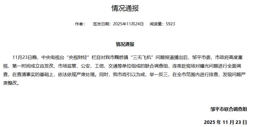 山东省滨州市邹平市联合调查组发布通报称,11月23日晚,中央电视台《央视财经》栏目播出了关于邹平市魏桥镇“三无飞机”问题的报道后,邹平市委、市政府高度重视。他们立即成立了由发展改革、市场监管、公安、工信、交通等单位组成的联合调查组。他们连夜赶赴现场,对暴露的问题进行全面排查。在查明事实的基础上,他们将面临严重的法律和监管合规。此前,据央视《财经调查》报道,有人举报短平台上有主播分享自己制作飞机或驾驶飞机的过程的视频,并依靠标签比如“农民造飞机”来吸引网友的喜欢和关注。据央视记者实地走访发现,市场上正在销售和流通一些没有型号合格证、制造许可证、适航许可证、所有权记录的飞机产品。南方网广东考察记者 陈蓉 - 上一篇:官方回应“凉山慈善列车游客围攻彝族老人”: