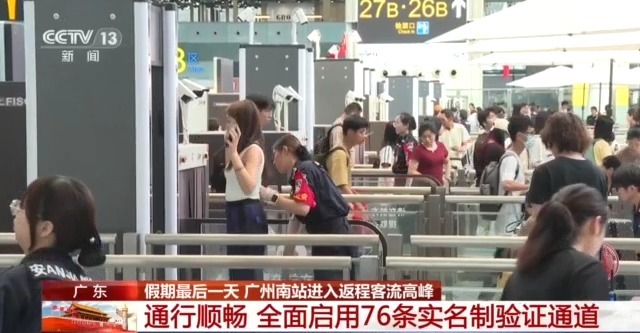 国庆、中秋假期期间,1日至7日,广东广州南站共进出旅客520.9万人次,日均进出旅客近74.4万人次。今天是假期的最后一天。广州南站客流量怎么样?流量畅通,76条实名认证通道全面启动。钱干明总部:10月6日起,广州南站进入假期返程客流高峰期。今天,不少旅客提着大大小小的行李来到候机大厅。为让旅客安检更加便捷,广州南站在客流高峰期间全面开通76条实名认证通道和48条安检通道。虽然安检口人流较多,但总体交通还是比较顺畅的。大约需要10分钟平均进入候车大厅。据铁路部门介绍,广州南站今天预计发送旅客33.5万人次,到达旅客49万人次。聚焦“关爱/紧急旅客通道”增设志愿者 除了增设核验通道、安检通道外,广州南站还设立“关爱/紧急旅客通道”,为即将搬离的老旅客等特殊旅客提供优先服务;增派青年志愿者70名,奔赴服务台、慈善等候区、母婴室等场所,及时解决旅客问题。国家铁路广州局增开列车并延长地铁运营时间。为满足旅客出行需求,国家铁路广州局通过加开列车、重新联动动车组、增设列车等多种方式,增加运能。高峰日的火车到高速列车。目前,计划开行旅客列车3731列,增开旅客列车607列,其中普通列车83列,动车组列车524列。新增线路主要为北京-广州、广州-深圳-香港、杭州-深圳、江站-湛江。 10月9日上午,计划增开高铁列车338列,主要并列潮汕、长沙、湛江等方向。此外,为满足旅客夜间出行的需求,今天,广州南站所在的广州地铁2号线、7号线运营时间仍将延长两个小时。末班车是次日凌晨 1:30。佛山地铁2号线运营时间延长1个半小时。