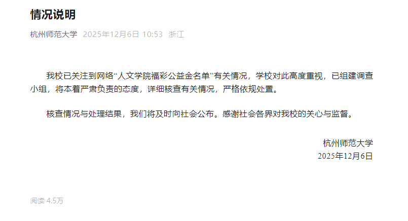 据“杭州师范大学”微信公众号12月6日消息,杭州师范大学发布声明:我校已提请关注网络上有关“人文学院福利彩票慈善榜”的相关情况。学校高度重视,成立了调查组。我们将本着认真负责的态度,详细核实相关情况,并严格按照规定进行处理。我们将及时向社会公布核查情况和处理结果。感谢社会各界对我校的关心和管理。近日,有网友反映,杭州师范大学人文学院官网发布的《多彩教育·淳味“福彩慈善基金项目(线上课程3)获奖名单》与《1纲要》中的姓名和顺序完全吻合。百度文库发布的《万个中国普通人》。杭州师范大学人文学院官网公告(网页截图)《万个中国普通人》(网页截图)据公开资料显示,杭州师范大学是浙江省属重点大学,是一所师范教育传统、文理并重、人文社科与自然科学协调发展的综合性大学。 2007年成立,拥有仓前、玉皇山、下沙三个校区。 - 上一篇:广东坚持以人民健康为中心,努力让医疗保险服